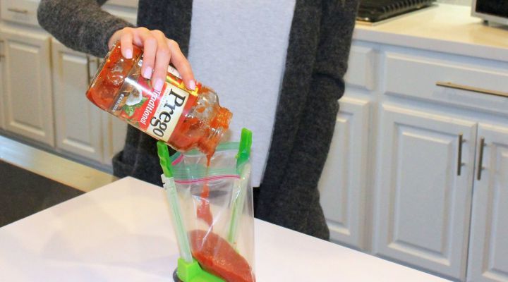 “I used three of these to help me make freezer meals for after I have a baby. I can honestly say I don’t know how I would have filled the freezer bags without these ingenious baggy holders. I was able to dump veggies, spices, meat, and cans of heavy beans and tomatoes into the bags, and they stood up the entire time without sliding or spilling. One of the bags I stuffed literally to the brim, as full as it could go, and the bag did not fall down. I would definitely recommend these.” – Grace S.